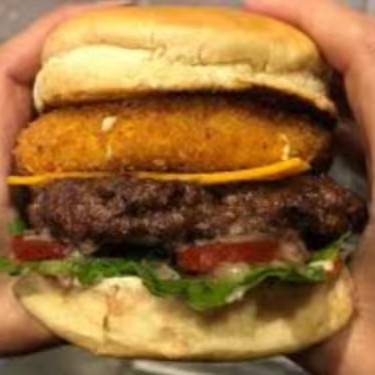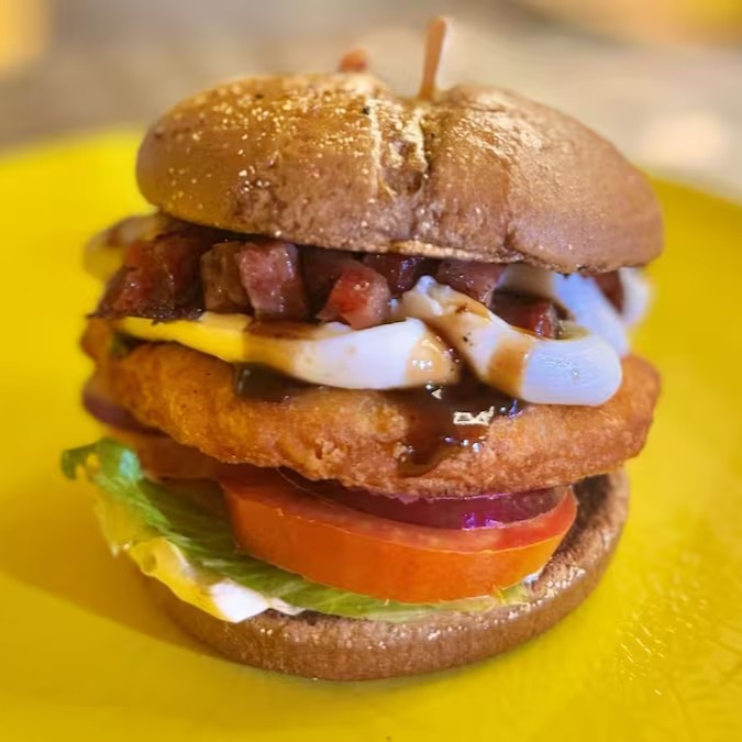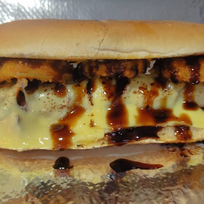 Pão brioche, Empanado de Frango ,bacon , maionese grill, queijo prato, Catupiry ou cheddar ,alface,tomate ,cebola roxa,barbecue.