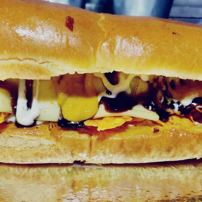Salsicha Frankfurt alemã com fatias de bacon enrolada, mussarela, maionese defumada, Doritos triturado, molho Bbq e mostarda.