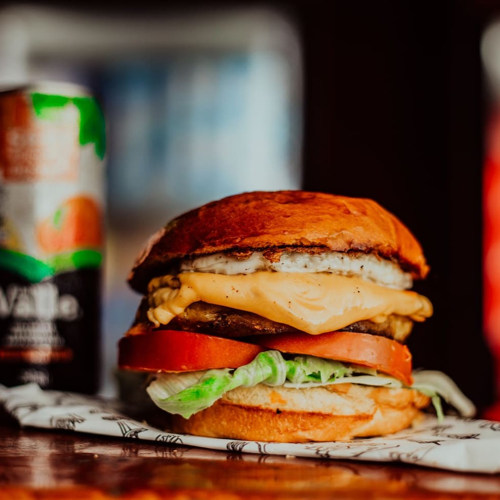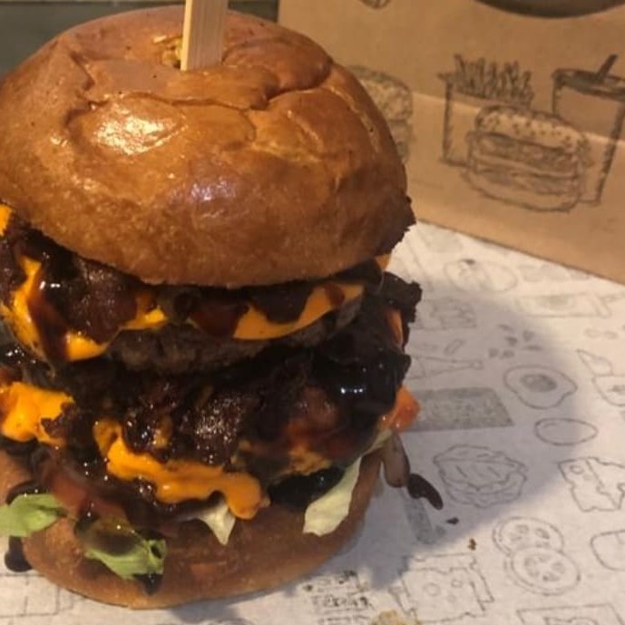 Pão brioche, 2 hambúrgueres da casa 180g, molho especial, queijo prato, cheddar ou Catupiry, molho barbecue, alface, tomate e cebola roxa