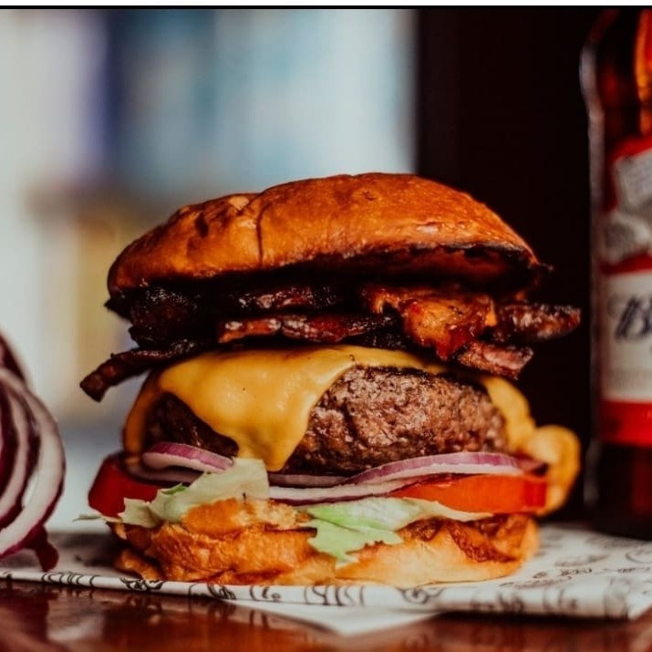 Pão brioche, hambúrguer da casa 180g, molho especial, queijo prato, bacon, cebola roxa, molho barbecue, alface e tomate
