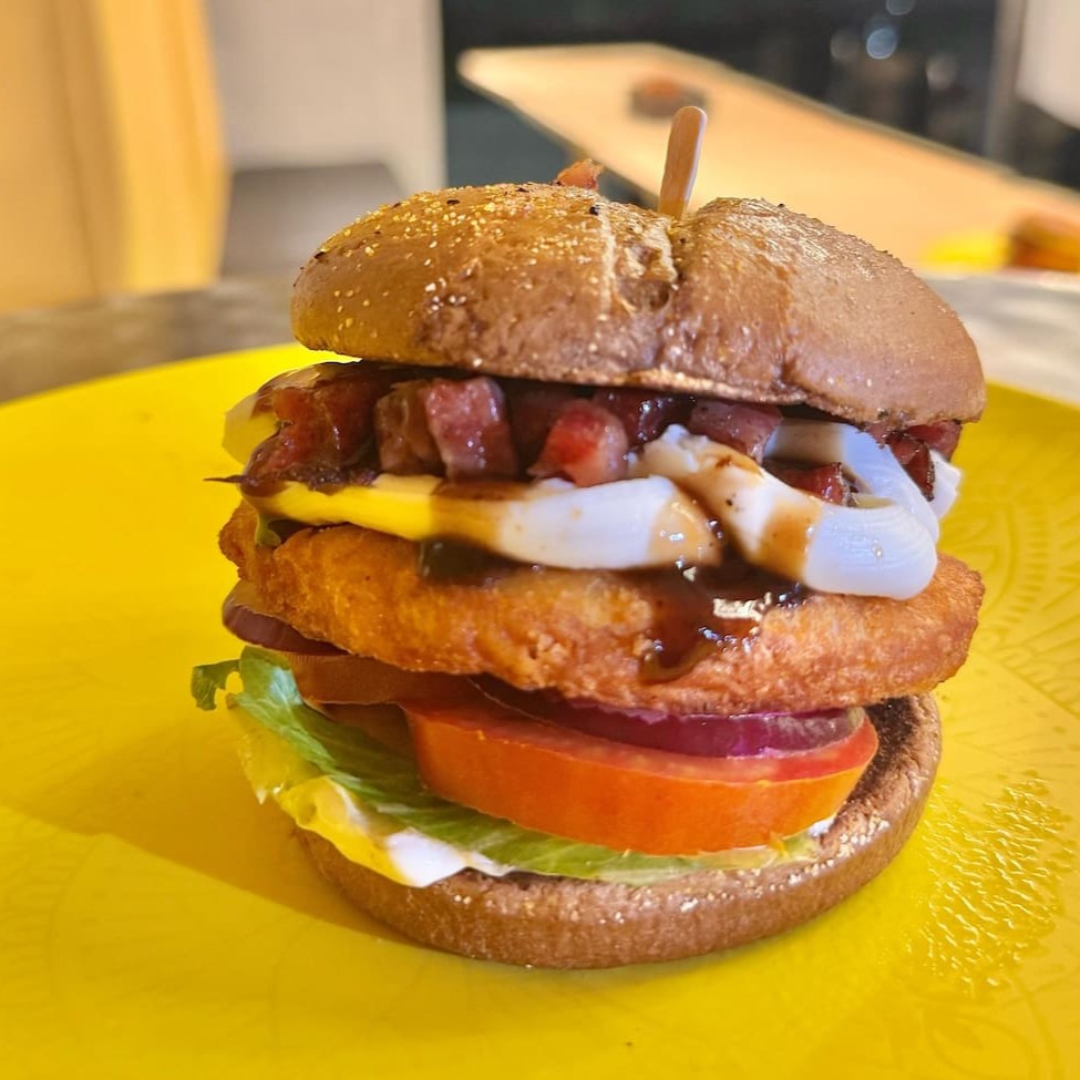 Pão brioche, Empanado de Frango, bacon , maionese grill, queijo prato, Catupiry ou cheddar ,barbecue,alface ,tomate e cebola roxa.