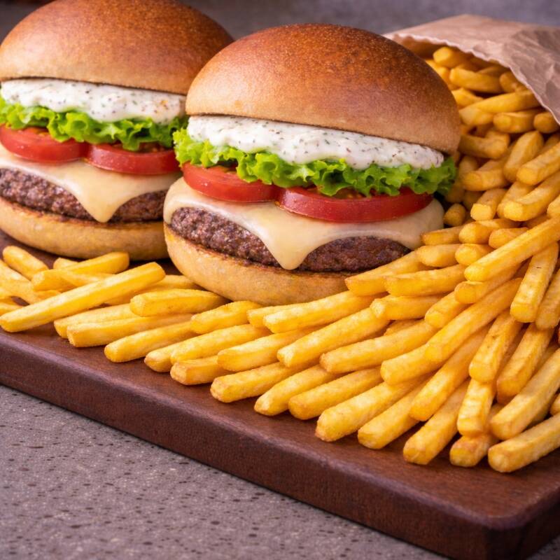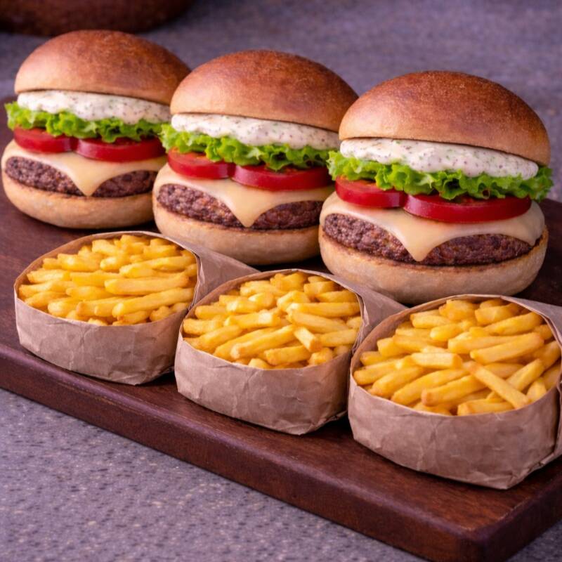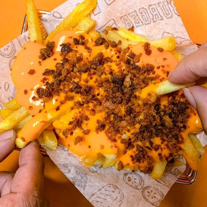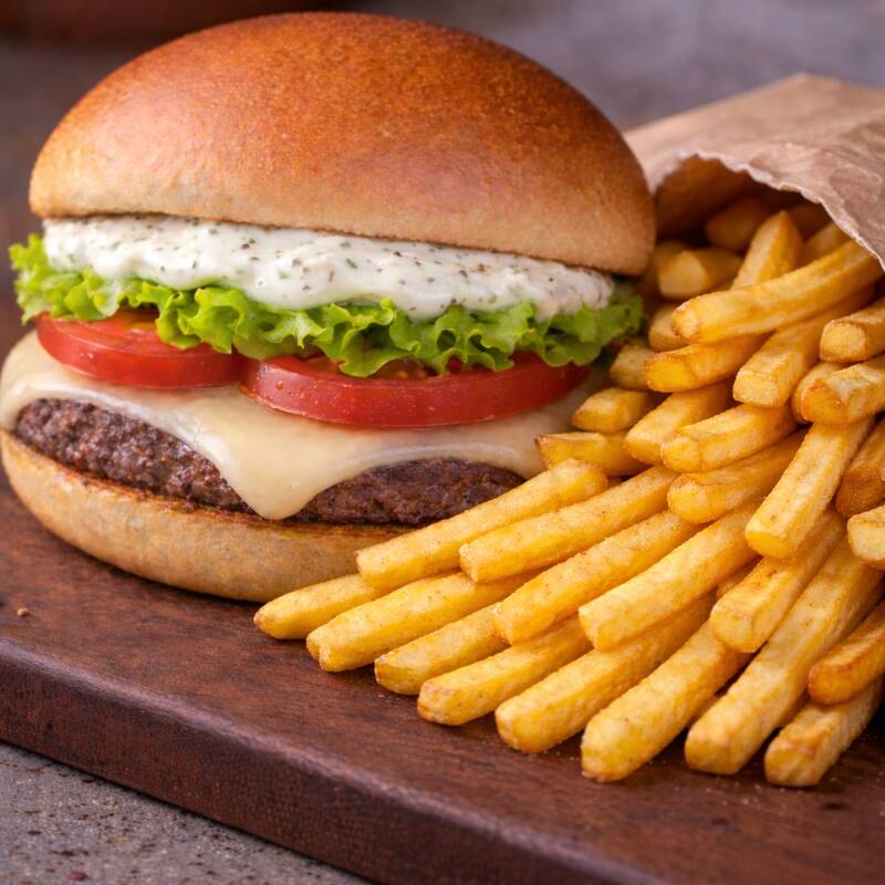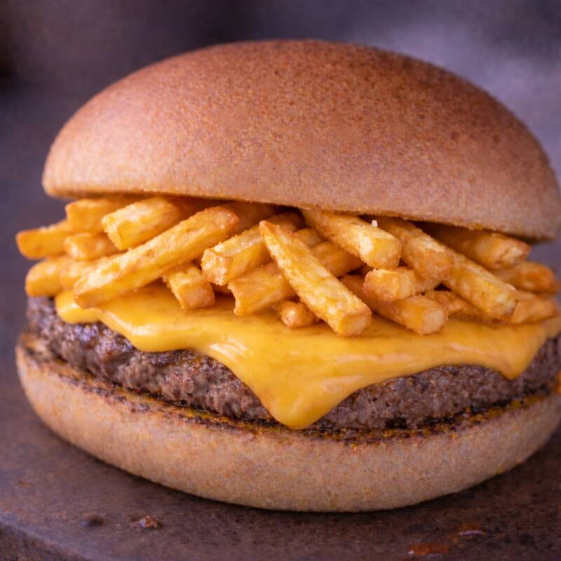 Pão de brioche + hamburguer 80g prensado + cheddar cremoso + batata frita + maionese artesanal
