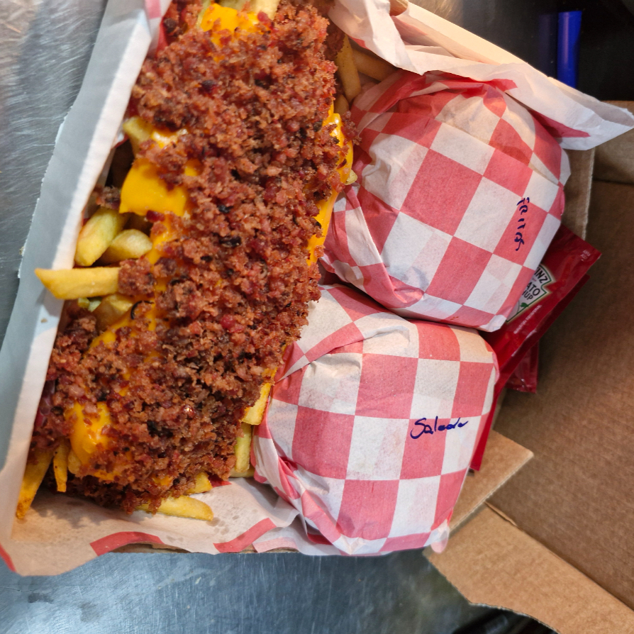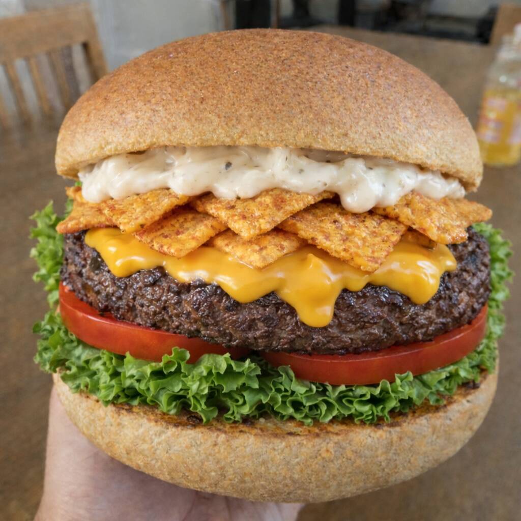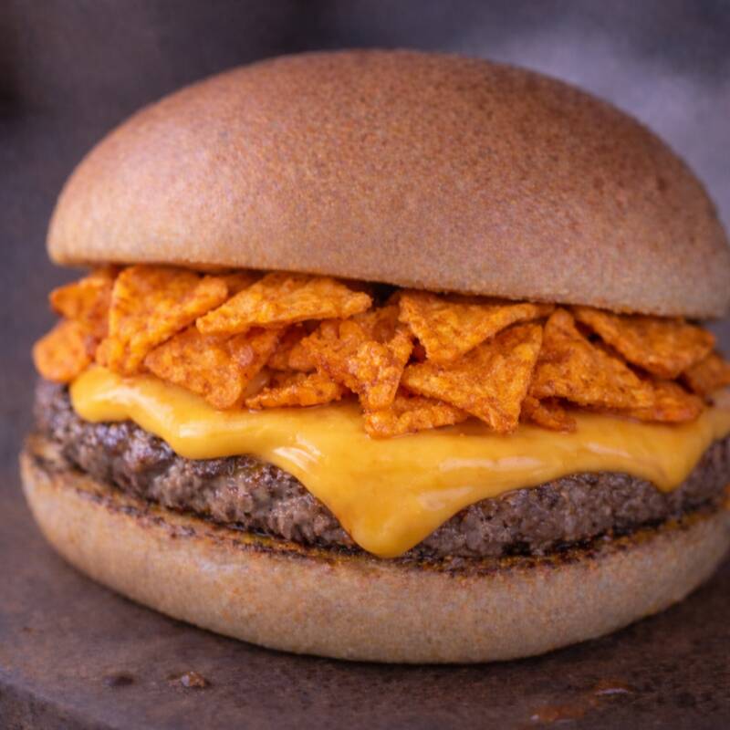 Pão de brioche + hamburguer 80g prensado + cheddar cremoso + doritos + maionese artesanal