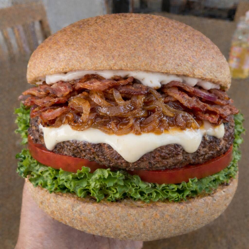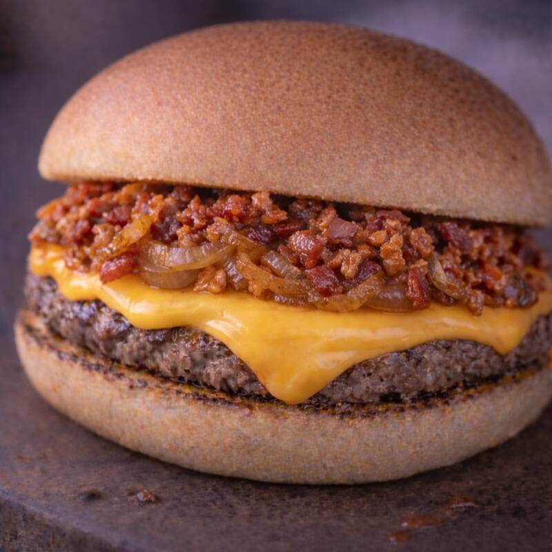 Pão de brioche + hambúrguer 80g prensado + cheddar + bacon + cebola caramelizada + maionese artesanal