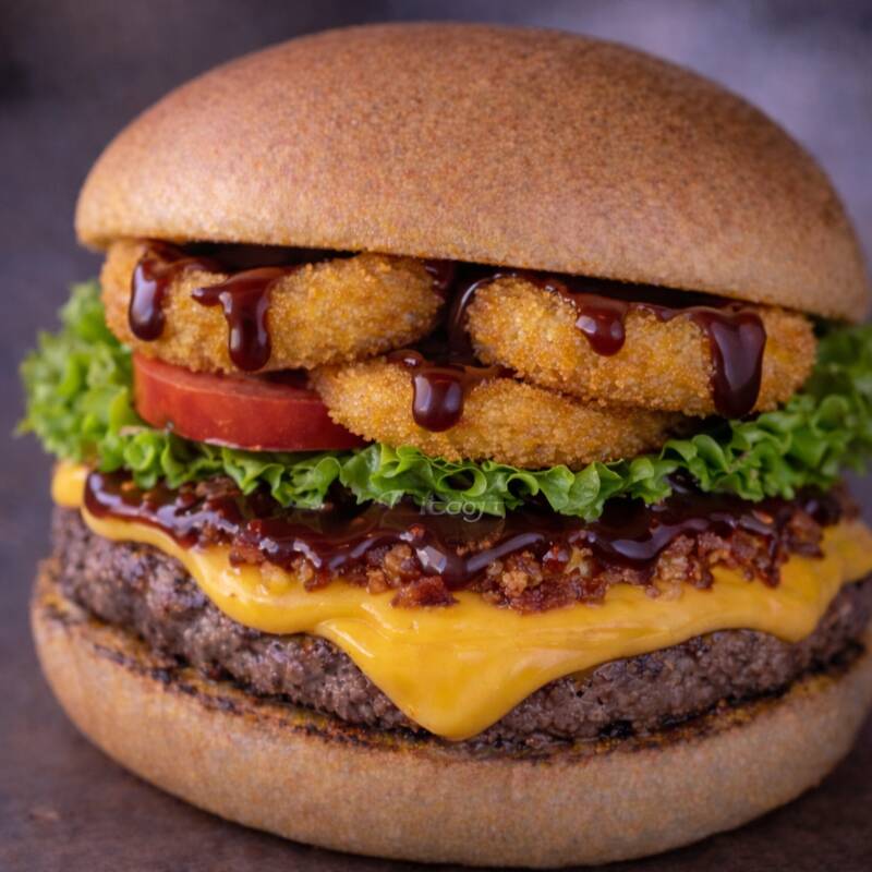 Pão de brioche + hambúrguer 80g prensado + cheddar cremoso + bacon + anel de cebola + barbecue + alface + tomate