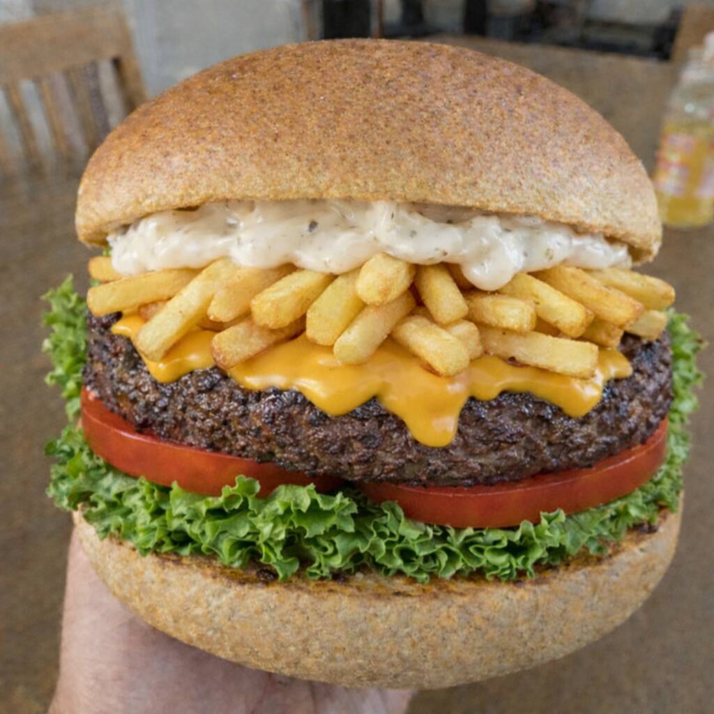 Pão brioche + hambúrguer 160g + queijo mussarela + cheddar cremoso + batata frita + bacon fatiado + alface + tomate + maionese artesanal