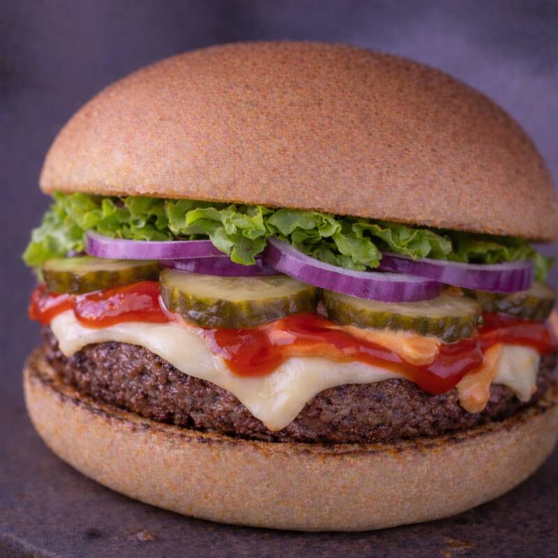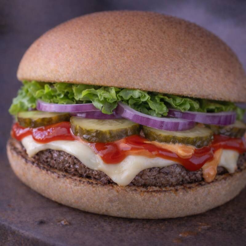 Pão de brioche + hambúrguer 80g prensado + queijo mussarela + picles + cebola + alface + molho americano