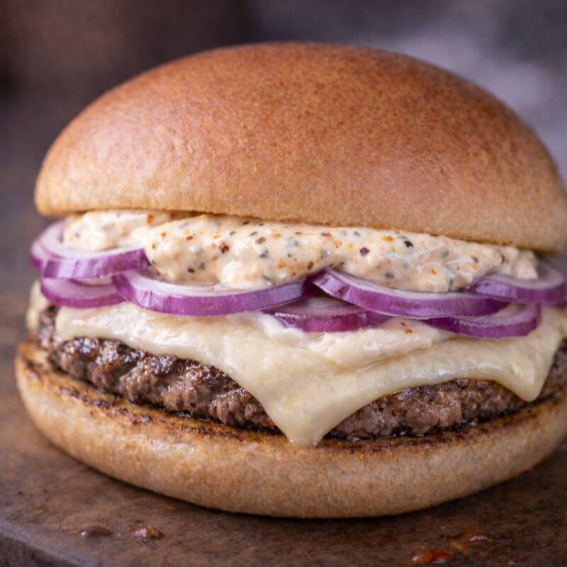 Pão de brioche + hambúrguer 80g prensado + cream cheese + cebola roxa + maionese artesanal