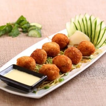 6 bolinhos de salmão empanados e crocante com molho do chef