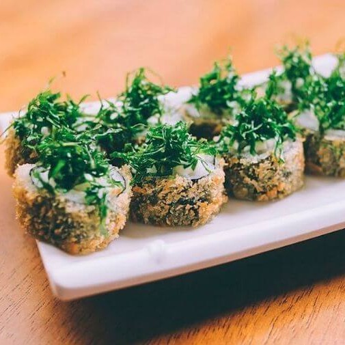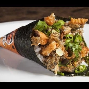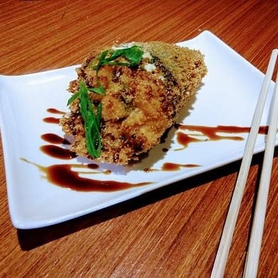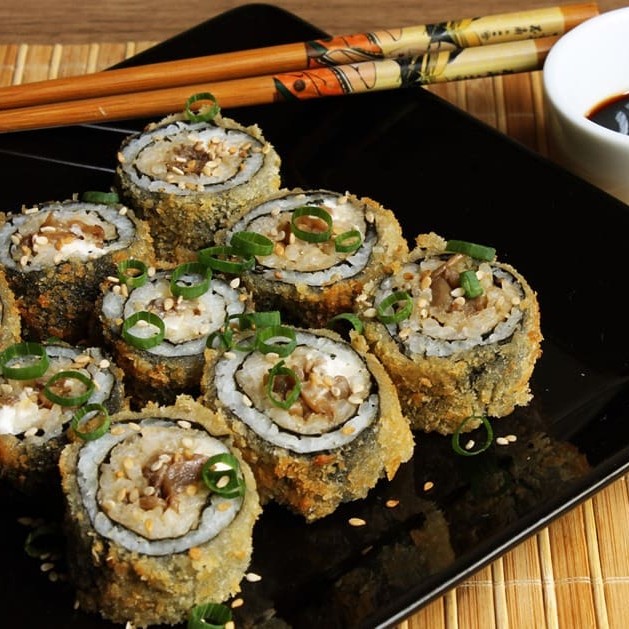 Temaki de shimeje empanado com creme de inhame e cebolinha