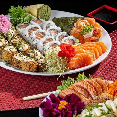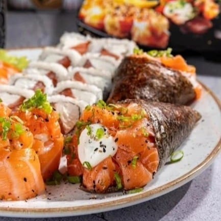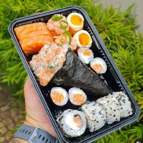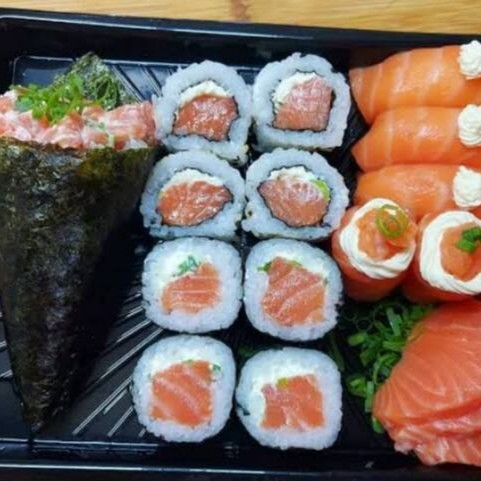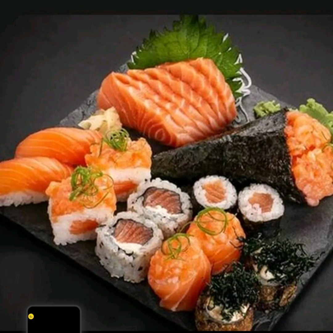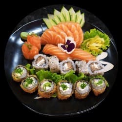6 sashimi de salmão 8 uramaki de salmão 4 niguiri de salmão 10 hot rool variados especial 1 temaki de salmão Filadélfia 1 temaki hot rool(#