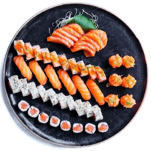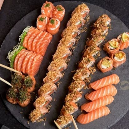 8 sashimis de salmão 4 uramaki de salmão Filadélfia 6 hossomaki de salmão 4 Joy de salmão 10 hot roll variados