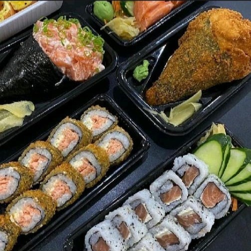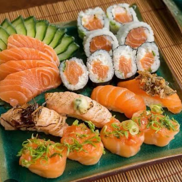 12 sashimi salmão 8 uramaki de salmão Filadélfia 8 uramaki especial de salmão grelhado 8 hossomaki de salmão grelhado 8 hossomaki de salmão 6 niguiri de salmão 6 Joy de salmão 10 hot rool variados