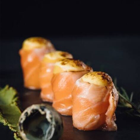8 fatias finas de salmão com azeite trufado com flor de salmão e limão siciliano ao toque do chef