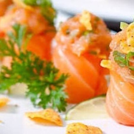 6 Joy variados de salmão com cream cheese maçaricados com couve frita ao toque do chef