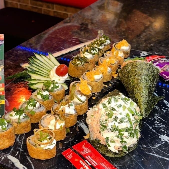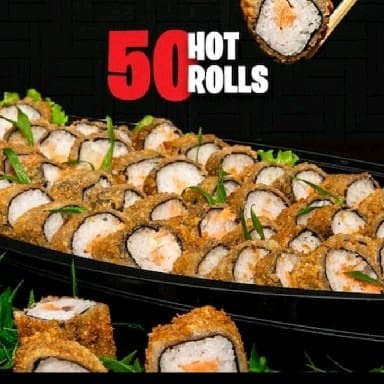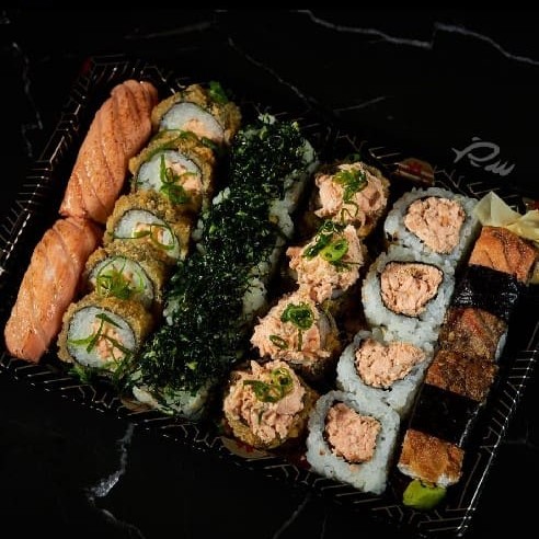 6 hot rool Filadélfia 4 hot rool especial salmão grelhado por cima 4 uramaki grelhado especial com Doritos 4 uramaki grelhado especial de couve 4 hossomaki de salmão grelhado 4 hot rool de banana com chocolate 2 niguiri maçaricados de salmão 2 niguiri skin bem frito