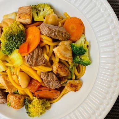 Yakisoba misto,carne frango legumes macarrão molho japonês ao toque do chef