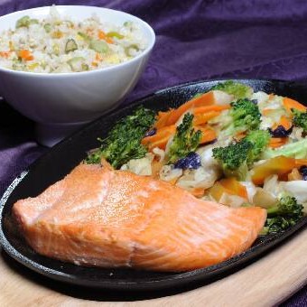 Teppan de salmão com legumes puxado no azeite de oliva com arroz japonês tempero ao toque do chef