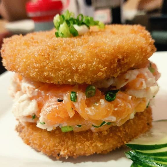 Sushi burguer de salmao grelhado ao toque do chef cream-cheese e cebolinha