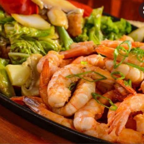 Teppan de camarão e legumes puxado no azeite de oliva com arroz japonês temperado ao toque do chef