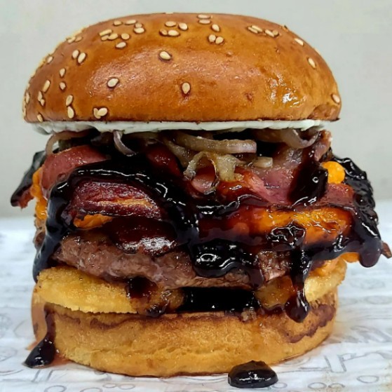 Pão brioche, 3 blend's, queijo de sua preferencia triplo, bacon triplo e maionese.