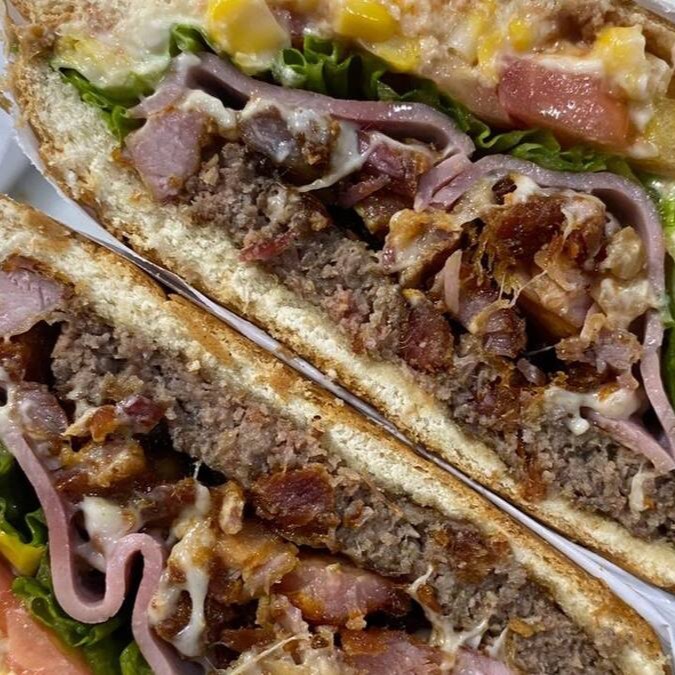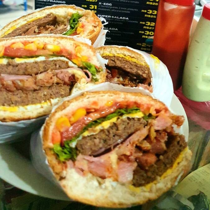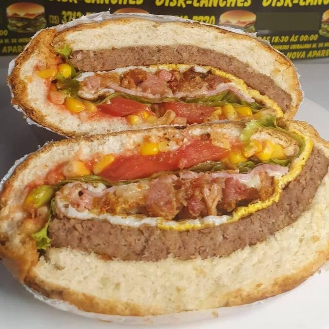 2 hamburgueres, 2 ovos, bacon, presunto, mussarela, milho, alface e tomate