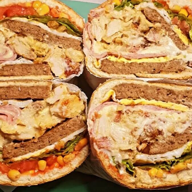 Frango, 2 hamburgueres, 2 ovos, bancon, milho, mussarela, presunto, alface e tomate
