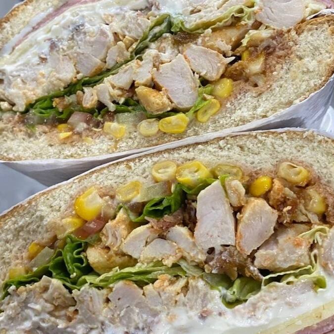 Frango, ovo, bacon, presunto, mussarela, milho, alface e tomate