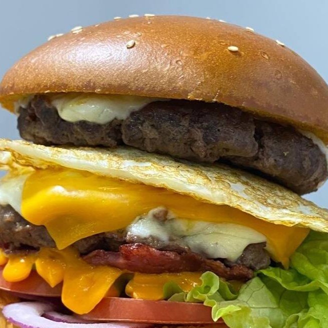 2 Hamburgureres artesanais, 1 ovo, mussarela, bacon, cebola roxa, alface, tomate, molho barbecue, molho da casa.