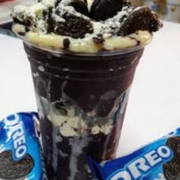 Açaí, Creme de Oreo, bolacha Oreo, leite em pó, cobertura chocolate