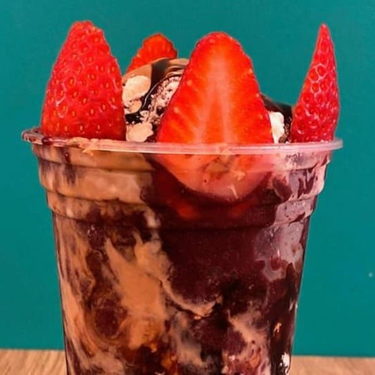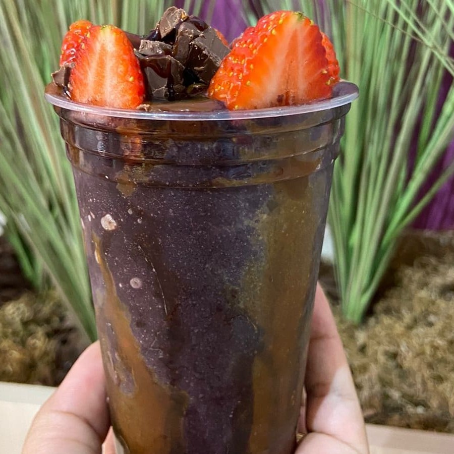 Açai, creme de coco branco, raspas de chocolate, leite Ninho e morango