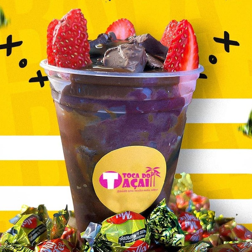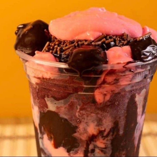 Açai, creme de brownie, leite condensado, granulado e mouse de morango