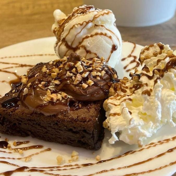 Deliosa fatia de brownie com uma bola de sorvete de creme chantilly, castanha de caju e cobertura de chocolate.