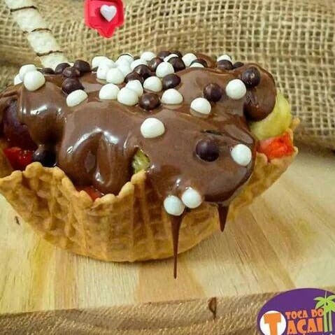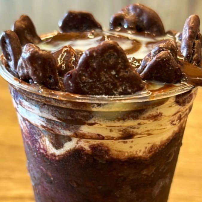 Acai, sorvete de creme, Ovomaltine e calda de chocolate