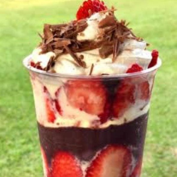 Creme de charge, leite em pó, morango e cobertura de caramelo