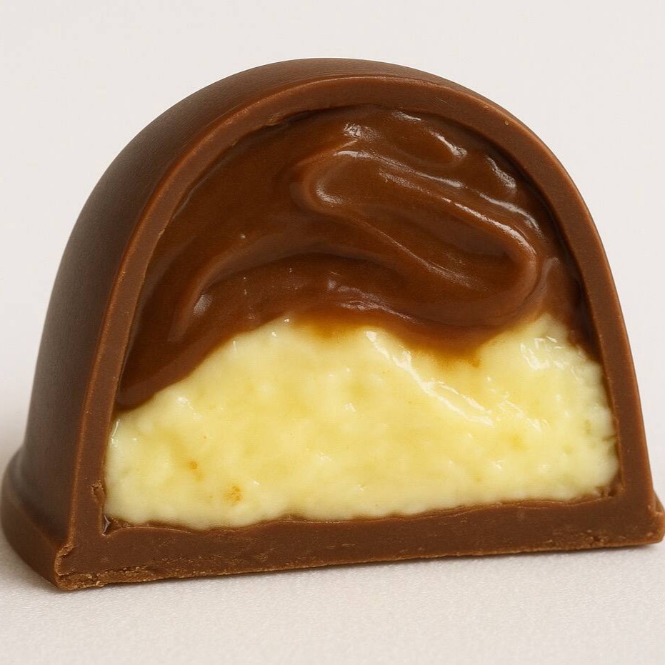 Recheio cremoso de coco, com textura macia e aveludada, sabor suave e levemente adocicado, equilibrado com o toque delicado do chocolate branco, trazendo uma sensação leve, refinada e irresistível ao paladar.