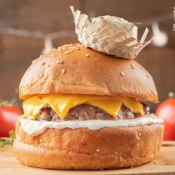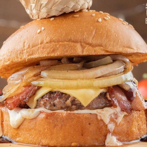 Pão Uai, delicioso blend bovino (150g), queijo prato, muito bacon, cebola, molho barbecue e maionese da casa