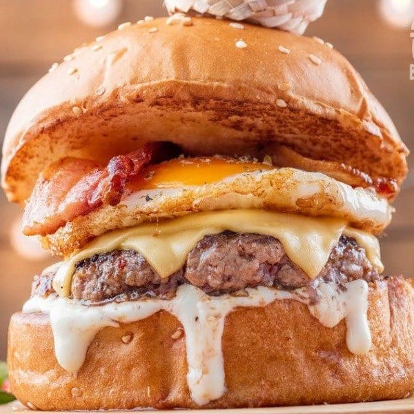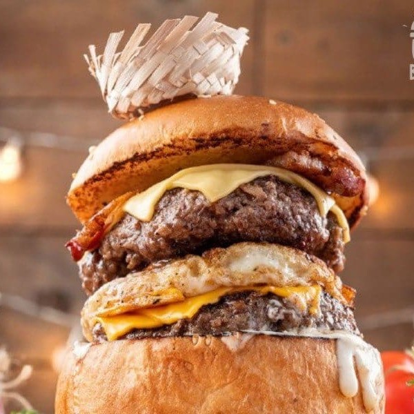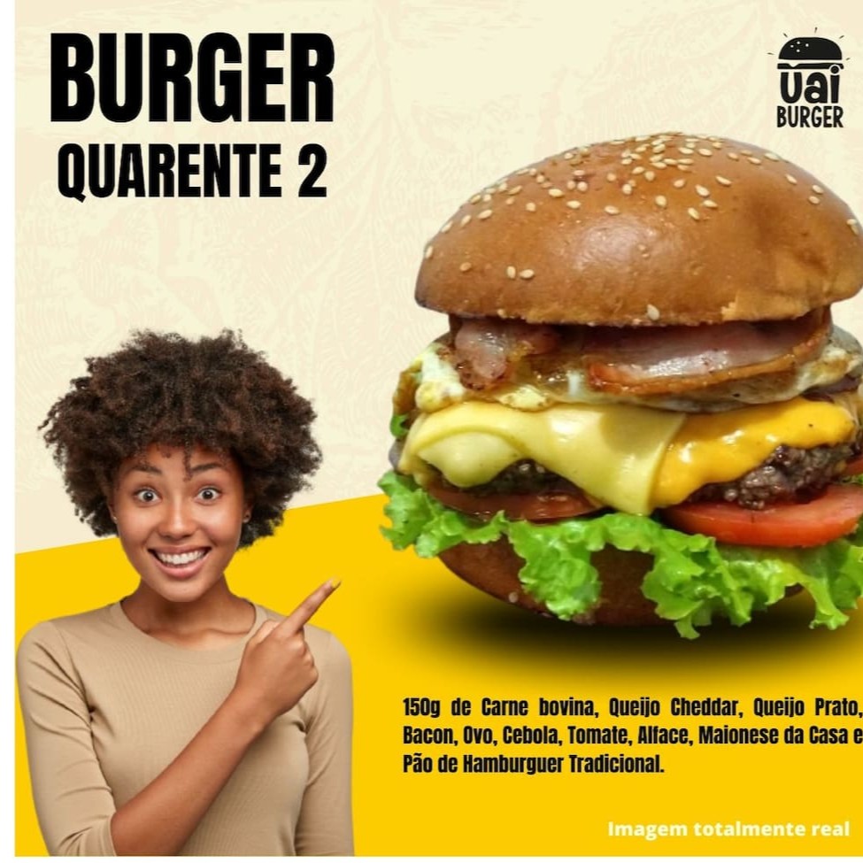 Pão Uai, 2 hambúrgueres (150g cada), queijo prato, queijo cheddar, ovo e maionese da casa