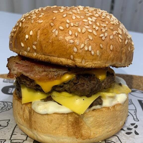Pão Uai, 2 smash bovino (100g cada), queijo cheddar, queijo prato, bacon e maionese da casa