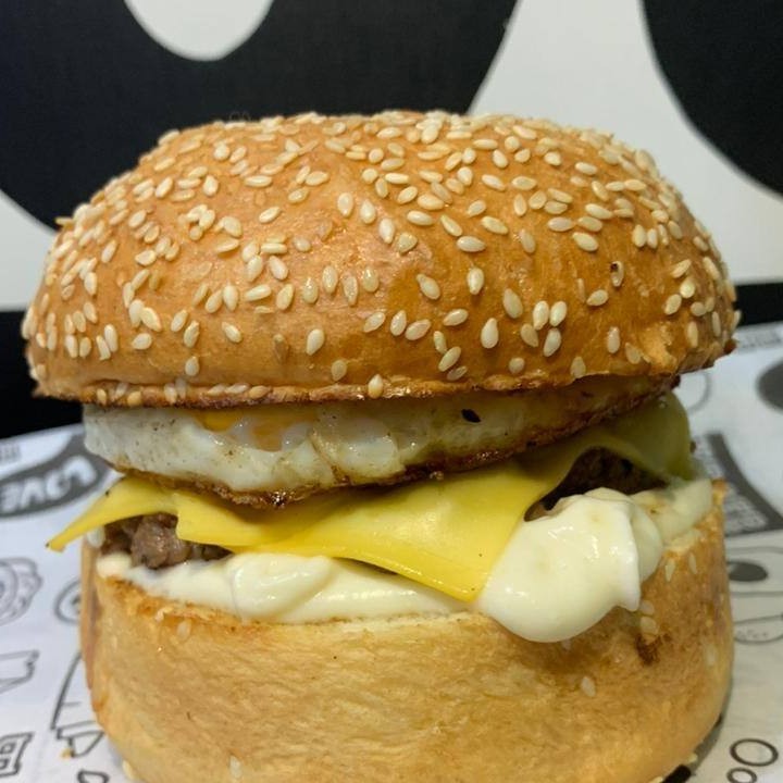 Pão Uai, delicioso smash bovino (100g), queijo cheddar, ovo e maionese da casa