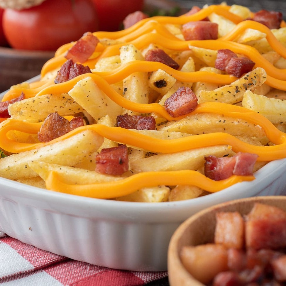 Hum aquele Bacon Frito e um cheddar cremoso, delícia. está porção vem com 400g de batata in natura