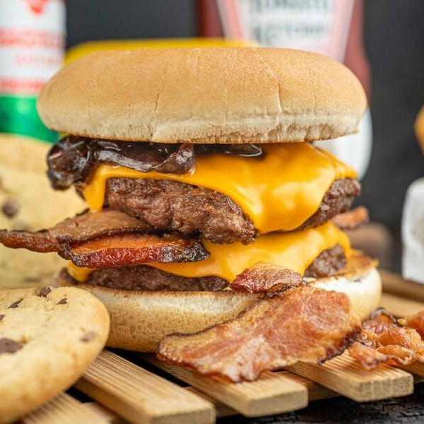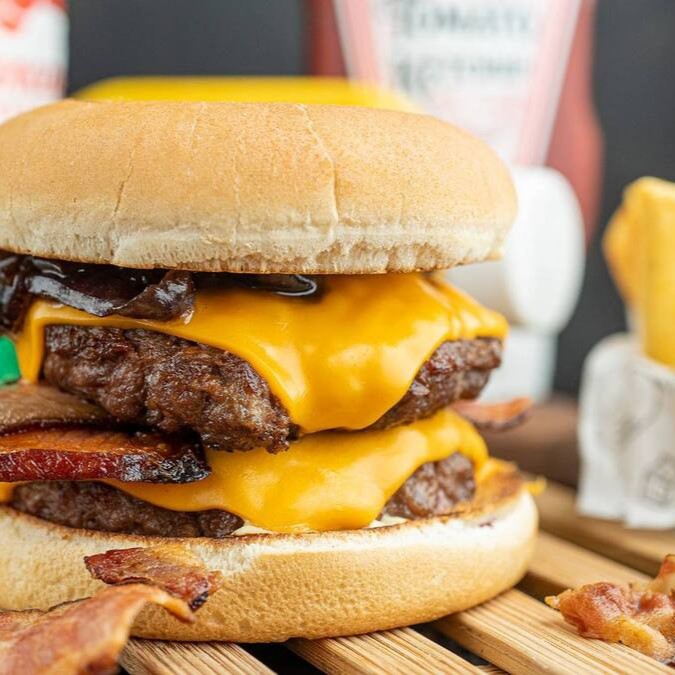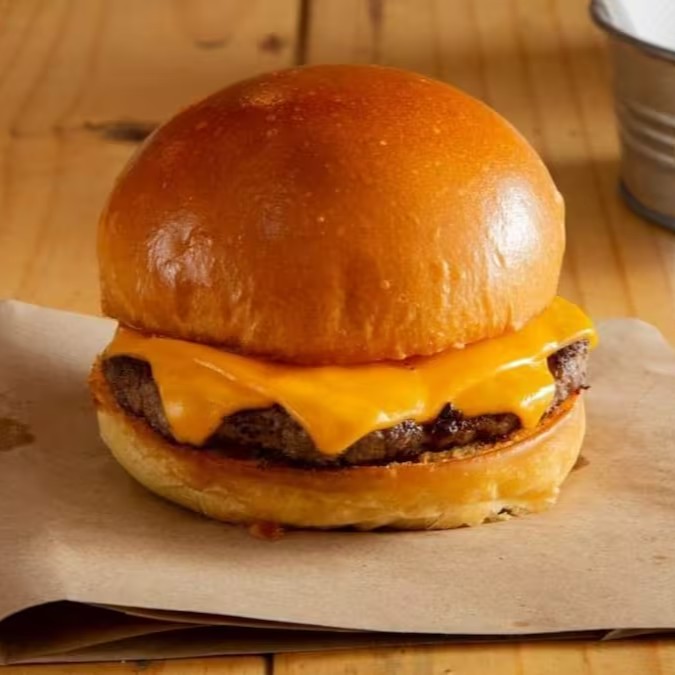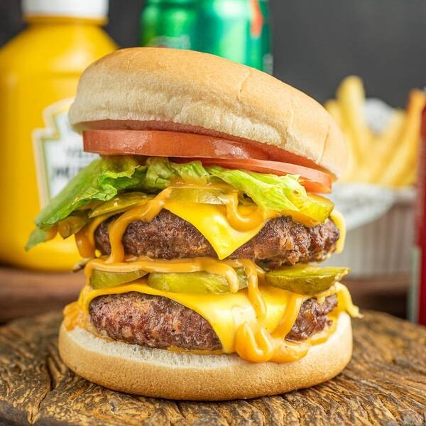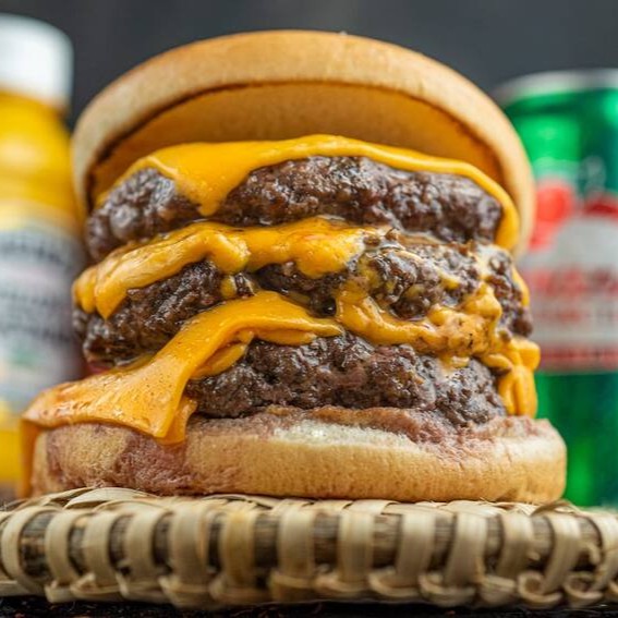 Pão, burger de 120 gramas, duplo cheddar, maionese da casa.