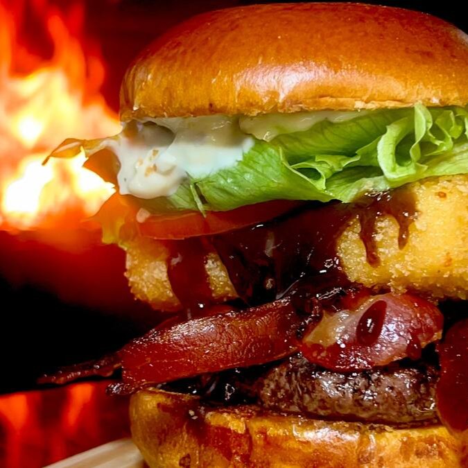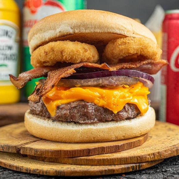 Pão, burger 120gr, cheddar, bacon, onion rings, salada e maionese da casa