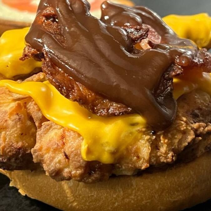 Pão Brioche, Filé de Frango empanado, duplo queijo cheddar, bacon, barbecue, maionese da casa e tomate