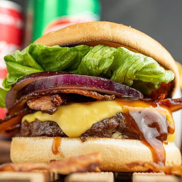 Pão, burger 120gr, queijo prato, bacon, barbecue, cebola, salada e maionese da casa