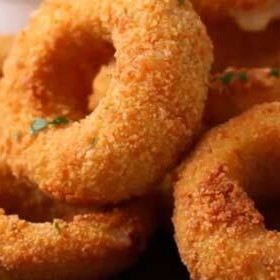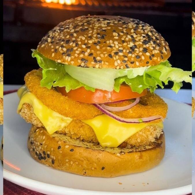 Pão, burger de queijo empanado na panco, onion rings, duplo queijo prato, salada e maionese da casa