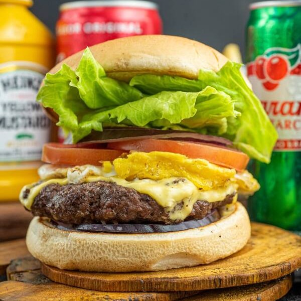 Pão, burger 120gr, queijo prato, ovo, cebola, salada e maionese da casa