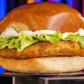 Pão, Filé de Frango empanado, cheddar inglês, picles e molho supremo (a base de picles).