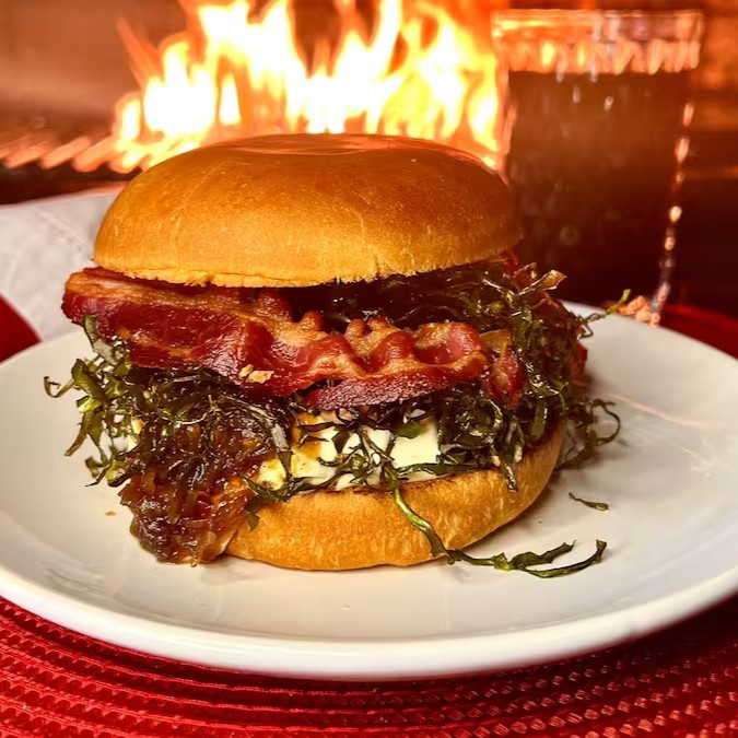 Blend 120gr, Cream cheese, uma deliciosa Geleia De Bacon(exclusiva da casa, Vai Cebola Na Base), couve crispy, bacon e maionese da casa.