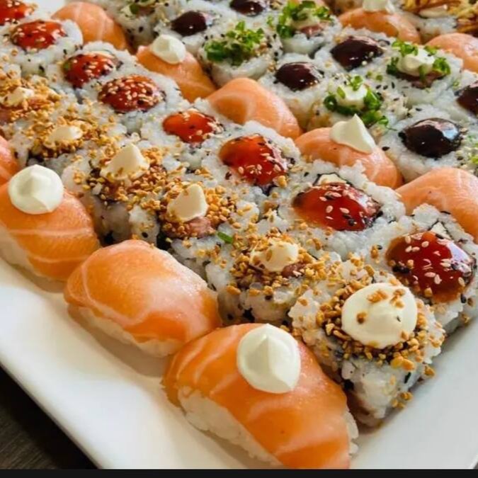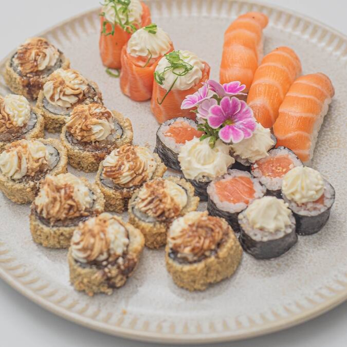 34 peças sendo 8 uramakis skin com cream cheese e couve,8 uramakis grelhados com geleia de pimenta,4 niguiris de salmão maçaricados,4 jyos de salmao maçaricados e 10 hot rolls variados